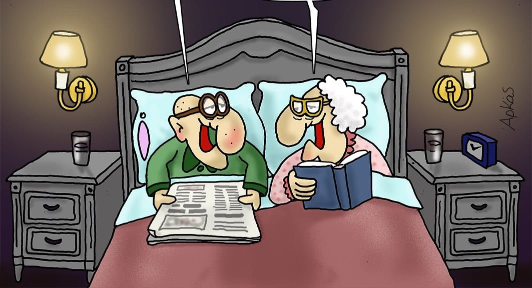 Στο σημερινό σκίτσο, απεικονίζονται ένας άνδρας και μία γυναίκα μεγάλης ηλικίας, ξαπλωμένοι στο κρεβάτι τους. Στα κομοδίνα υπάρχουν ποτήρια με νερό, ενώ δίπλα τους σιγοκαίνε οι λάμπες του υπνοδωματίου, δημιουργώντας μια ήσυχη, οικεία ατμόσφαιρα. Ο άνδρας κρατά στα χέρια του μια εφημερίδα, ενώ η γυναίκα είναι απορροφημένη σε ένα βιβλίο.