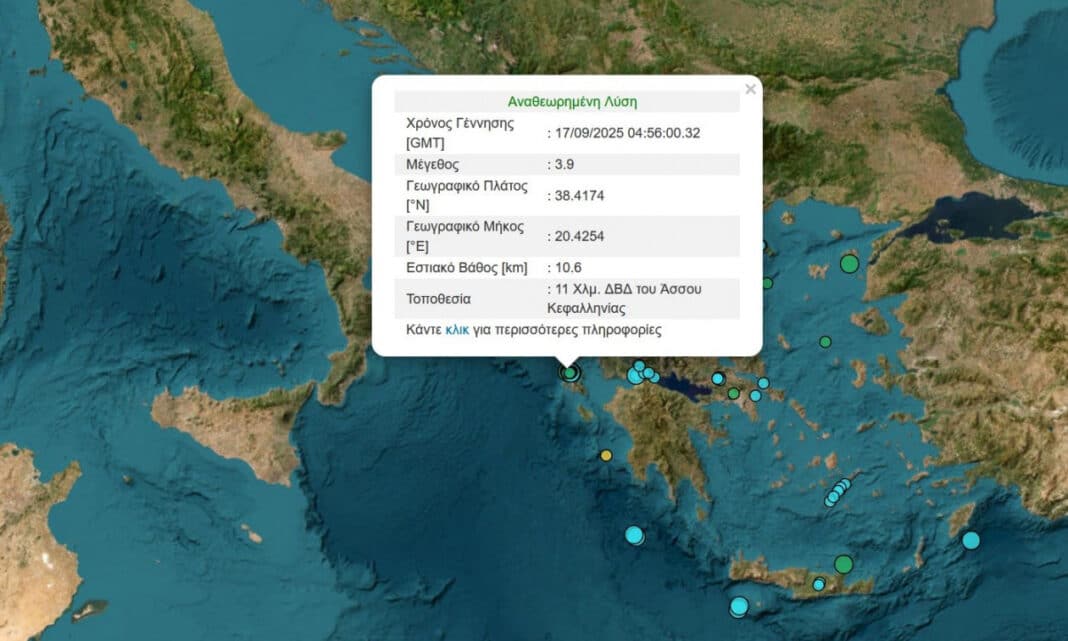 Σεισμική δόνηση μεγέθους 3,9 βαθμών της κλίμακας Ρίχτερ, σύμφωνα με την αναθεωρημένη λύση του Γεωδυναμικού Ινστιτούτου του Αστεροσκοπείου Αθηνών, σημειώθηκε το πρωί της Τετάρτης (17/9) στις 07:56 κοντά στις βόρειες ακτές της Κεφαλονιάς.