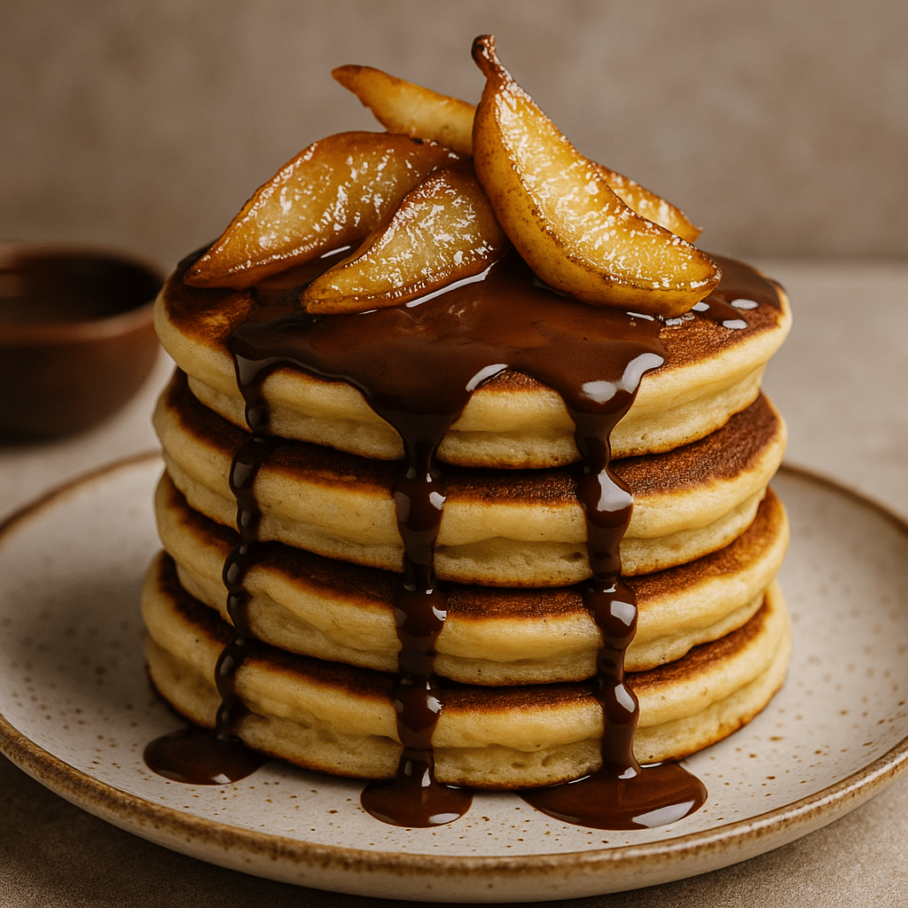Τα pancakes αποτελούν ένα από τα πιο αγαπημένα και λαχταριστά πρωινά ή brunch, συνδυάζοντας αφράτη υφή με απεριόριστες δυνατότητες γαρνιρίσματος. Αν θέλετε να αναβαθμίσετε την κλασική συνταγή, τα καραμελωμένα αχλάδια και η σοκολάτα είναι ο τέλειος τρόπος. Τα αχλάδια, με το φυσικό τους άρωμα και τη γλυκιά γεύση τους, δένουν αρμονικά με τη βελούδινη σοκολάτα, δημιουργώντας ένα γλυκό που θυμίζει γκουρμέ επιδόρπιο, ενώ παραμένει εύκολο και γρήγορο στην εκτέλεση. Αυτή η συνταγή είναι ιδανική για να εντυπωσιάσετε την οικογένεια ή τους φίλους σας σε ένα χαλαρό πρωινό Σαββατοκύριακου ή ακόμα και ως ένα γλυκό κλείσιμο ενός δείπνου.