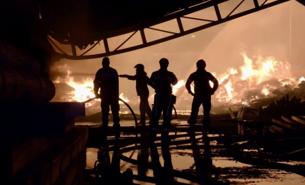 Συνεχίζεται η μάχη για την κατάσβεση της μεγάλης φωτιάς που εκδηλώθηκε το απόγευμα της Παρασκευής σε επιχείρηση ξυλείας.