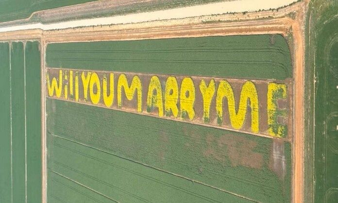 Μια δασκάλα δημοτικού σχολείου στην Αυστραλία βρίσκεται… στα σύννεφα, καθώς δέχθηκε μια ιδιαίτερη πρόταση γάμου από τον σύντροφό της. Ένας αγρότης από τη Νέα Νότια Ουαλία, ο Γουίλ Χέντερσον, σχημάτισε σ’ ένα χωράφι την τεράστια φράση για την αγαπημένη του, Στεφ Κάρτερ. Μία φράση που μπορούσαν να τη δουν μόνο… από ψηλά.