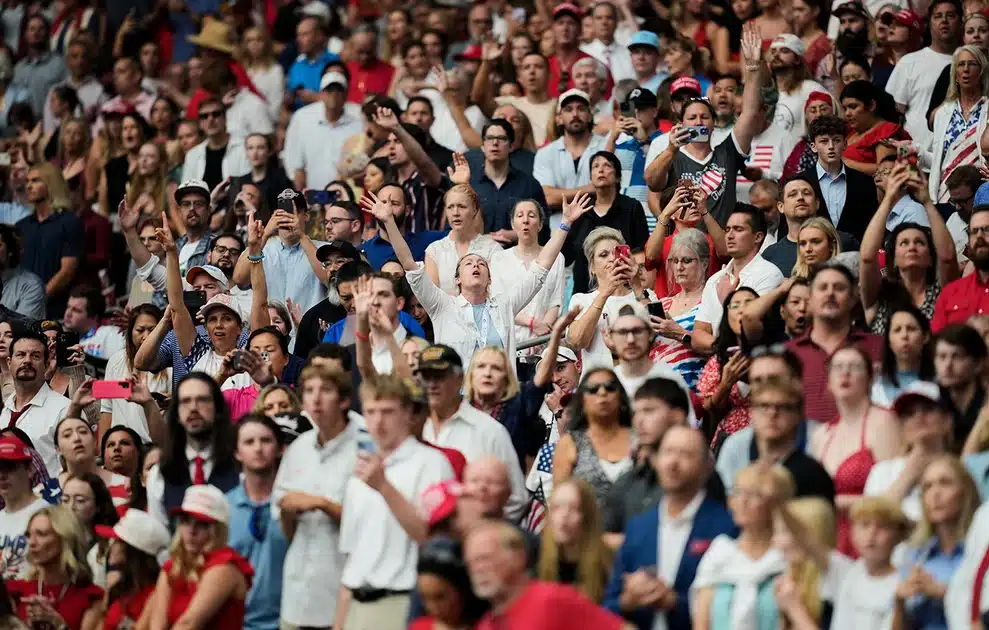 Χιλιάδες άνθρωποι περίμεναν για ώρες έξω από το στάδιο, ενώ αρκετοί είχαν κατασκηνώσει από το προηγούμενο βράδυ για να εξασφαλίσουν θέση. Το πλήθος φορούσε καπέλα «MAGA», ρούχα με το λογότυπο του Τραμπ και εμφανίσεις σε κόκκινο, λευκό και μπλε.