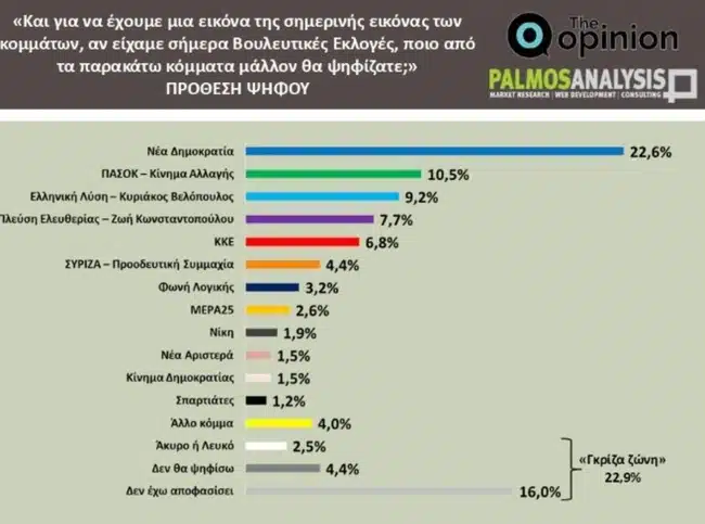 Η έρευνα, που πραγματοποιήθηκε σε 1.058 άτομα την περίοδο 15-19 Σεπτεμβρίου, δείχνει ότι η Νέα Δημοκρατία διατηρεί ισχυρό προβάδισμα με 22,6%, ακολουθούμενη από το ΠΑΣΟΚ με 10,5%. Στη συνέχεια έρχονται: η Ελληνική Λύση με 9,2%, η Πλεύση Ελευθερίας με 7,7%, το ΚΚΕ με 6,8%, ο ΣΥΡΙΖΑ με 4,4% και η Φωνή Λογικής με 3,2%.