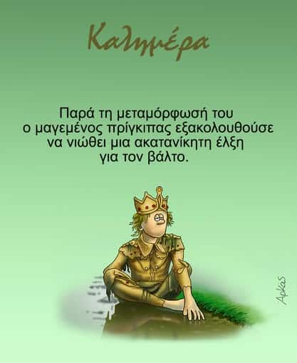 Ο Αρκάς, μάς καλημερίζει σήμερα με ένα σκίτσο με τον «πρίγκιπα» που κάθεται σκεφτικός, φορώντας ακόμη την κορόνα του, ενώ στο μυαλό του τριγυρίζει μια παράξενη σκέψη: «Αν και έγινε πρίγκιπας, ο πρώην βάτραχος δεν μπορούσε να αποχωριστεί την έλξη που του ασκούσε πάντα ο βάλτος».