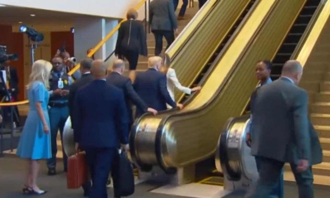 Ακριβώς τη στιγμή που ετοιμάζονταν να ανέβουν, η κυλιόμενη σκάλα σταμάτησε ξαφνικά, αναγκάζοντας το ζεύγος Τραμπ να συνεχίσουν ανεβαίνοντας τα σκαλοπάτια.