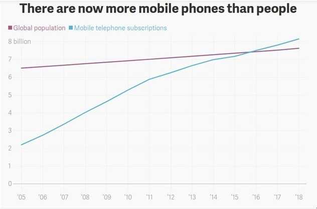 Τα στοιχεία που δίνουν στη δημοσιότητα ο Οργανισμός Ηνωμένων Εθνών, η Παγκόσμια Τράπεζα, αλλά και η Διεθνής Ένωση Τηλεπικοινωνιών και δημοσιεύει η επιθεώρηση Quartz, πιστοποιούν ότι εντός της παρούσας δεκαετίας ο αριθμός των ενεργών συνδέσεων κινητής τηλεφωνίας και των συσκευών κινητής τηλεφωνίας είναι μεγαλύτερος από τον πληθυσμό της Γης. Αυτό δεν πρέπει να μας οδηγήσει στο συμπέρασμα ότι κάθε κάτοικος του πλανήτη έχει στην κατοχή του τουλάχιστον ένα κινητό τηλέφωνο, αφού τα στοιχεία δείχνουν ότι 1.1 δισεκατομμύριο άνθρωποι δεν έχουν καν πρόσβαση σε ηλεκτρισμό, άρα δεν έχει νόημα να κατέχουν ένα κινητό.