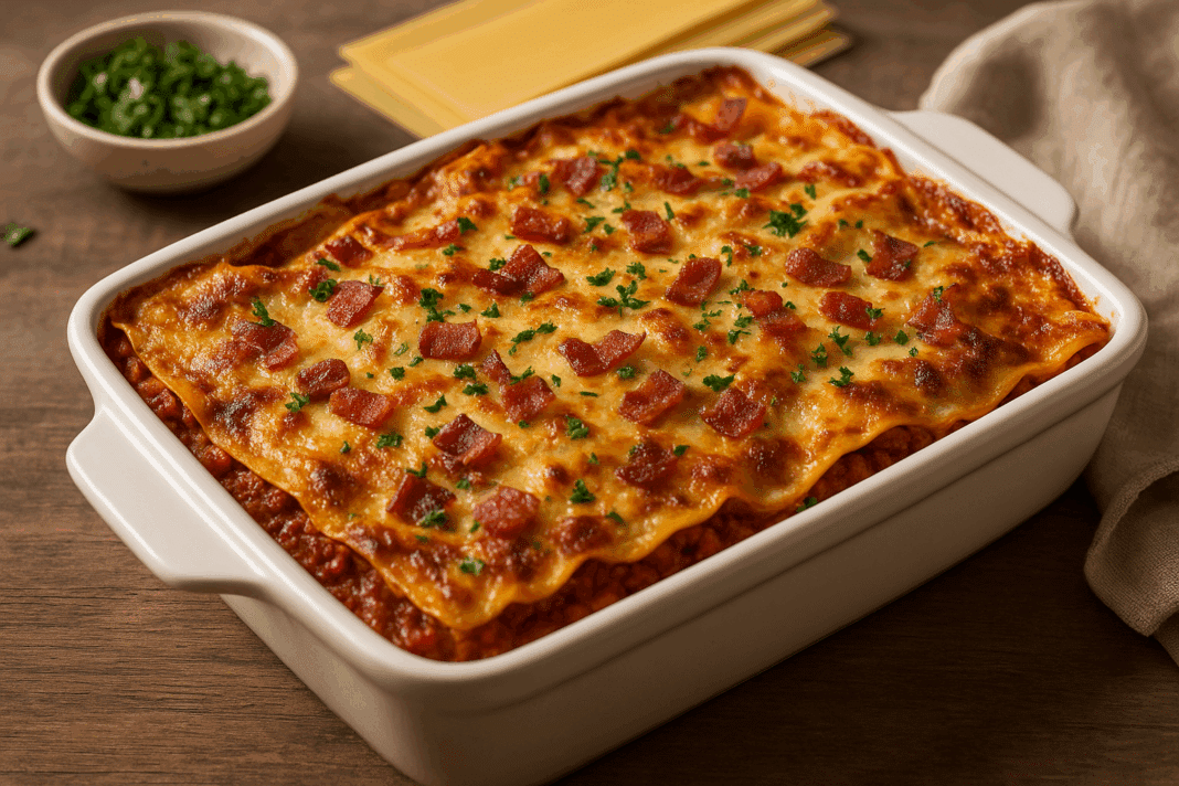 Τα λαζάνια είναι από τα πιο αγαπημένα πιάτα της ιταλικής κουζίνας, που έχουν κερδίσει επάξια μια θέση στο ελληνικό οικογενειακό τραπέζι. Ο συνδυασμός της ζεστής, πλούσιας σάλτσας, της κρέμας μπεσαμέλ, του λιωμένου τυριού και των στρώσεων ζυμαρικών δημιουργεί ένα πιάτο που φέρνει μαζί όλη την οικογένεια. Σε αυτή τη συνταγή, προσθέτουμε μπέικον για πιο πλούσια γεύση και αλμυρή ένταση που απογειώνει το αποτέλεσμα. Είναι ιδανικό φαγητό για Κυριακάτικο τραπέζι, για παρέα με φίλους ή για ένα τραπέζι που θέλει να εντυπωσιάσει με κάτι απλό, χορταστικό και γεμάτο νοστιμιά.