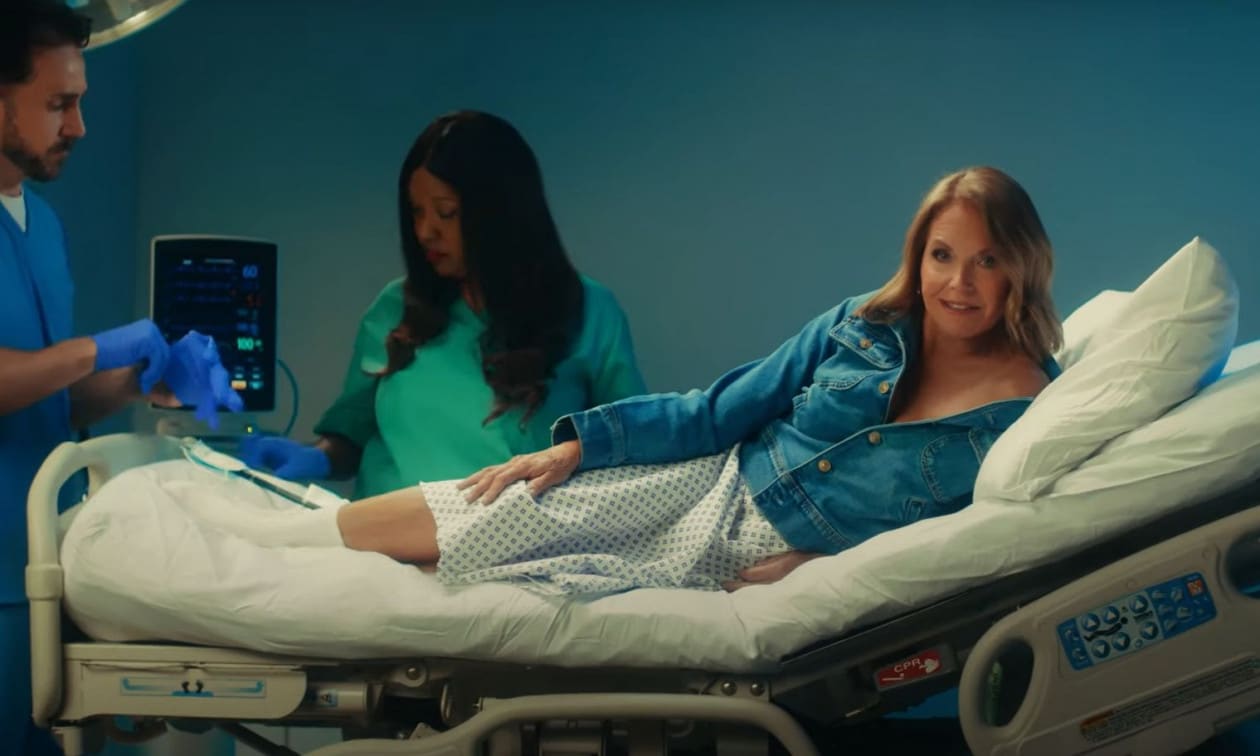 Η Katie Couric, όμως, χρησιμοποίησε το χιούμορ της για να αλλάξει την ρητορική της διαφήμισης και να μιλήσει για την υγεία, κάνοντας μια αναφορά στην περίφημη κολονοσκόπηση της, που προβλήθηκε στον αέρα το 2000, όταν ήταν παρουσιάστρια της εκπομπής «Today» του NBC, η οποία έγινε προς τιμήν του εκλιπόντος συζύγού της, ο οποίος έχασε τη μάχη με την ασθένεια το 1998, σε ηλικία 42 ετών.