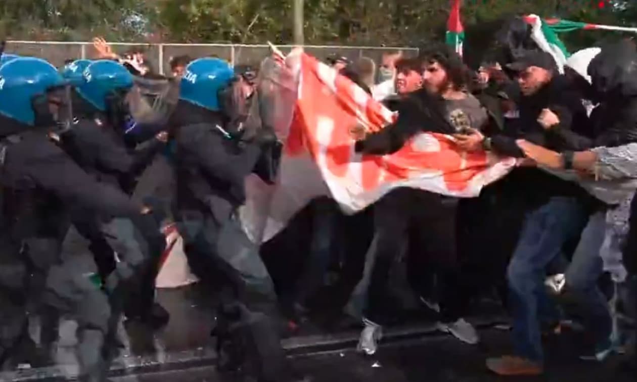 Οι άνδρες της ιταλικής αστυνομίας έκλεισαν τον δρόμο και έκαναν χρήση ασπίδων, δακρυγόνων και αντλιών νερού. Οι διαδηλωτές απάντησαν με μπουκάλια, ξύλινα καντάρια απο σημαίες, πέτρες και καπνογόνα. Σύμφωνα με τις μέχρι τώρα πληροφορίες από τις συγκρούσεις έχουν τραυματιστεί τουλάχιστον 10 διαδηλωτές και 2 αστυνομικοί.