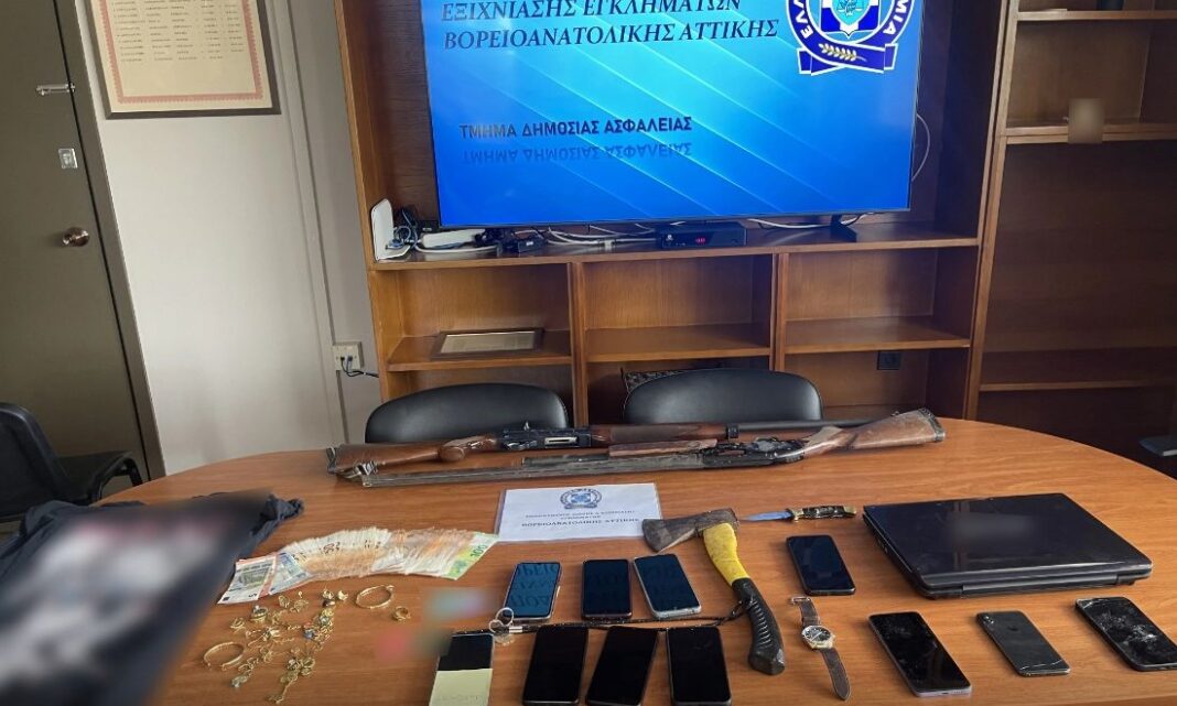 Κατασχέθηκαν, μεταξύ άλλων, ρουχισμός και παπούτσια, 25 κινητά τηλέφωνα, καταγραφικό σύστημα καμερών, τσεκούρι, επαναληπτική καραμπίνα, μαχαίρι τύπου σουγιά, μονόκανη κυνηγετική καραμπίνα, φορητός υπολογιστής, κουτί με διάφορα χρυσαφικά, 2 ρολόγια, 11 αλυσίδες λαιμού και το χρηματικό ποσό των 10.320 ευρώ