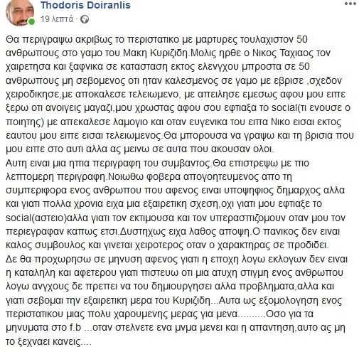 Το επεισόδιο κατήγγειλε αργότερα με ανάρτηση του στο facebook ο Θόδωρος Δοϊρανλής: