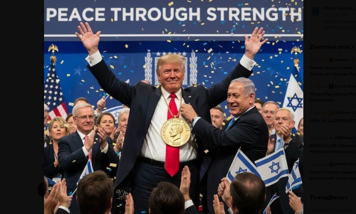 Μάλιστα, με τη βοήθεια της Τεχνητής Νοημοσύνης εμφανίζει τον Τραμπ σαν να είχε λάβει το βραβείο.