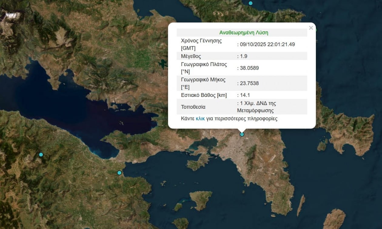 Ασθενής σεισμική δόνηση μεγέθους 1,9 βαθμών της κλίμακας Ρίχτερ, σύμφωνα με την αναθεωρημένη λύση του Γεωδυναμικού Ινστιτούτου του Αστεροσκοπείου Αθηνών, σημειώθηκε στη 01:01 μετά τα μεσάνυχτα (Παρασκευή 10/10), σε περιοχή της Αττικής, κοντά στην Μεταμόρφωση.
