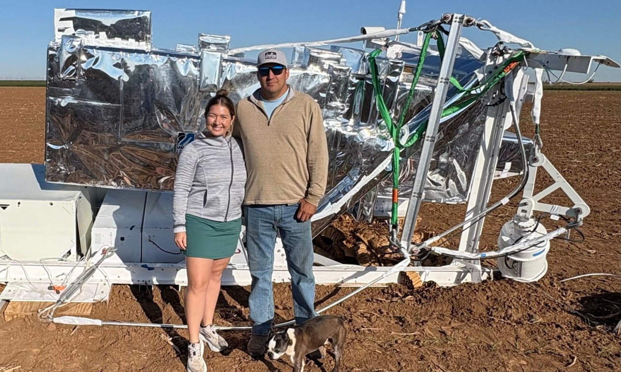 Η Ann Walter στέκεται μπροστά από ένα ερευνητικό όργανο της NASA που έπεσε από τον ουρανό κοντά στο σπίτι της στο Edmonson του Τέξας, την Πέμπτη 2 Οκτωβρίου 2025. (Ann Walter μέσω AP)