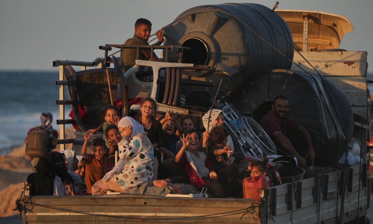 Μια εκτοπισμένη παλαιστινιακή οικογένεια ταξιδεύει με ένα φορτηγό, με κατεύθυνση την πόλη της Γάζας, την Παρασκευή 10 Οκτωβρίου 2025