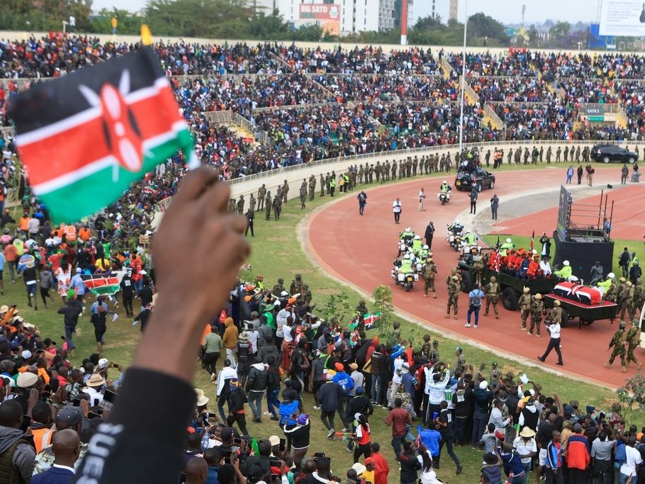 Η τελετή είχε ξεκινήσει ομαλά το πρωί, στο στάδιο Νιάγιο, έναν χώρο μικρότερο από το γήπεδο που χρησιμοποιήθηκε χθες. Ο πρόεδρος της Κένυας Ουίλιαμ Ρούτο εμφανίστηκε μάλιστα πλάι στην οικογένεια του θανόντος.