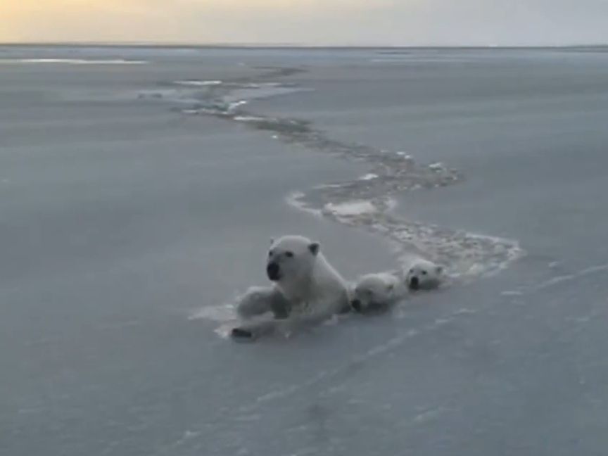 Περιβαλλοντολόγοι στη Γιακουτία της βόρειας Ρωσίας, κατέγραψαν ένα σπάνιο θέαμα, στο οποίο φαίνεται μια θηλυκή πολική αρκούδα με τα δύο μικρά της να διασχίζουν τα νερά ενός παγωμένου ποταμού.