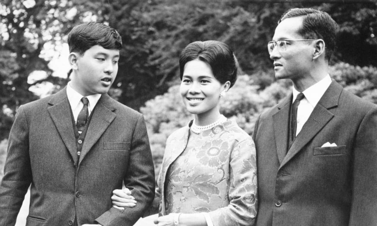 Ο βασιλιάς Μπουμιμπόλ της Ταϊλάνδης, δεξιά, περπατά με τη σύζυγό του, βασίλισσα Σιρίκιτ, στο κέντρο, και τον 13χρονο γιο τους, πρίγκιπα Βατζιραλονγκκόρν, στους κήπους της κατοικίας τους στο Σάνινγκχιλ, Μπέρκσαϊρ, στις 27 Ιουλίου 1966.