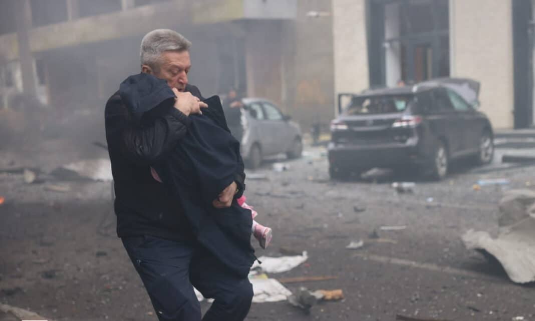 Ο Ολεξάντρ Βόλομπουγιεφ κρατά ένα μικρό παιδί στην αγκαλιά του μετά την επίθεση ρωσικού drone σε νηπιαγωγείο.