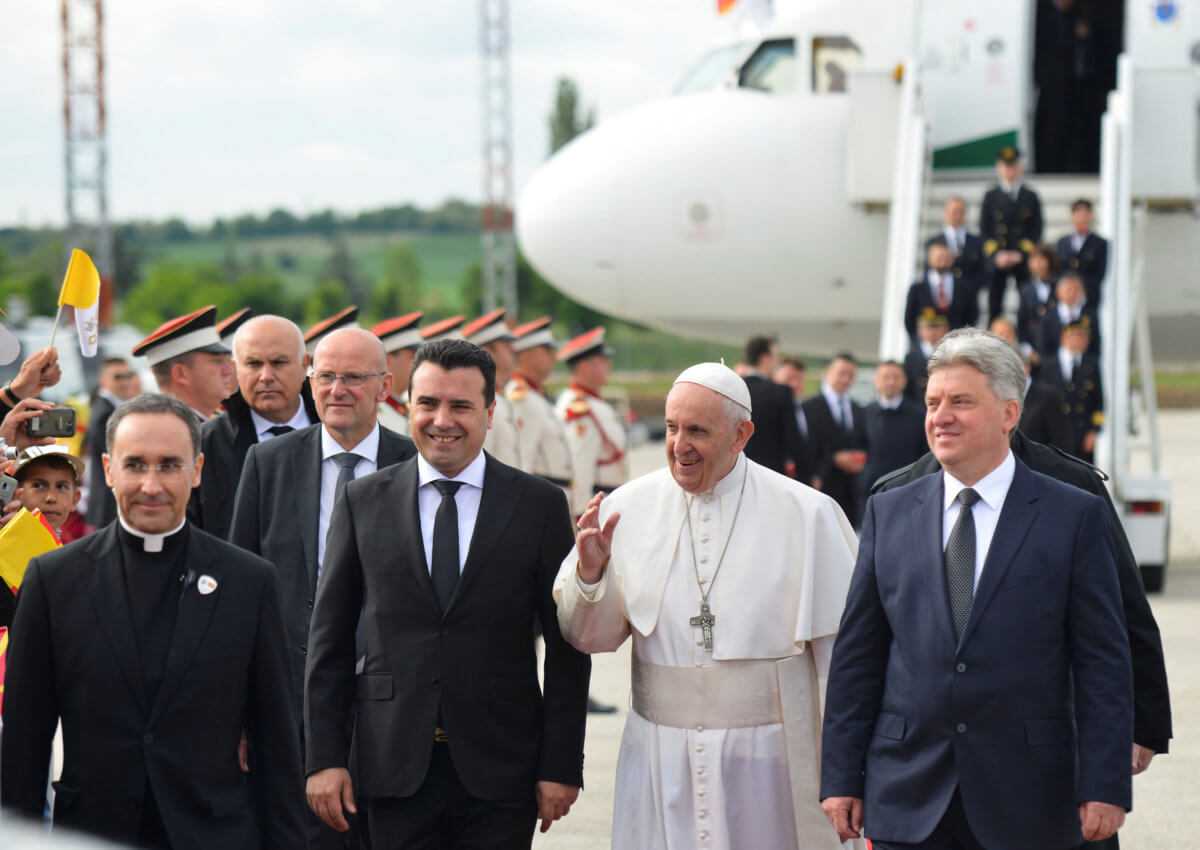 Ο Πάπας έγινε δεκτός στο αεροδρόμιο από τον Πρόεδρο της Βόρειας Μακεδονίας Γκιόργκε Ιβάνοφ και τον πρωθυπουργό Ζόραν Ζάεφ, με όλες τις τιμές και με το παραδοσιακό έθιμο (ψωμί και αλάτι).