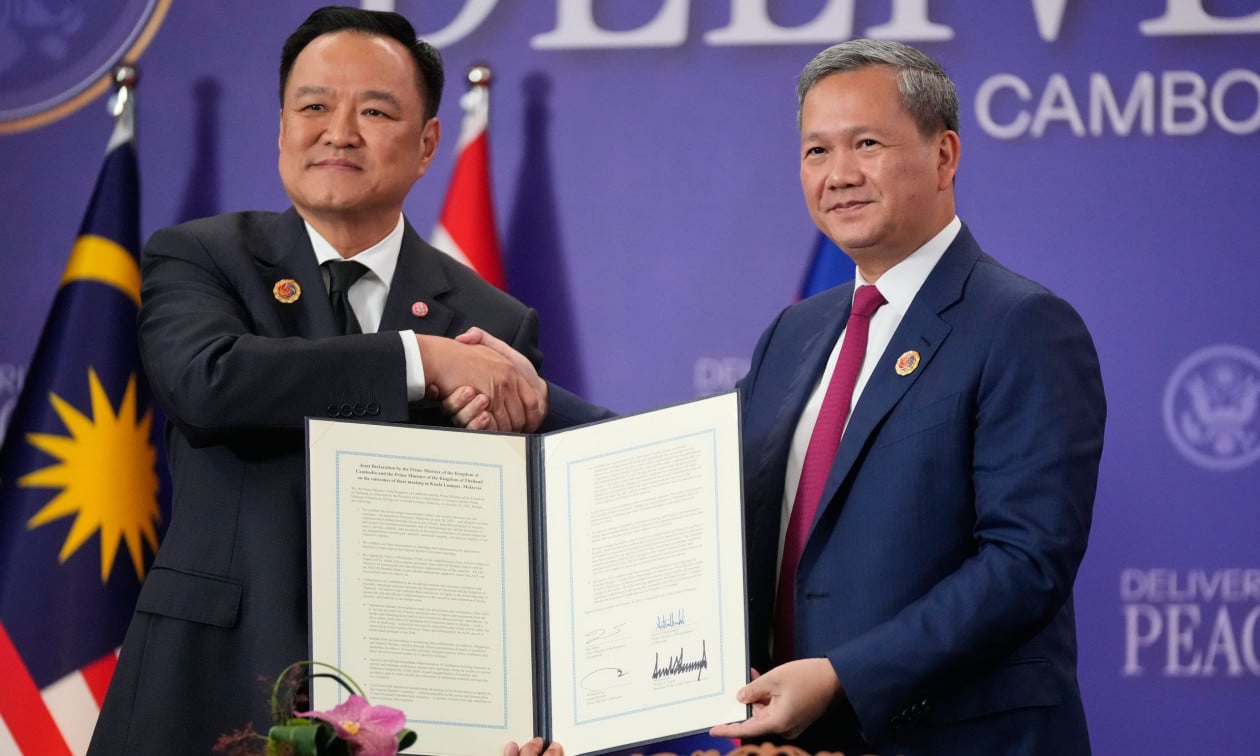 Ο πρόεδρος των ΗΠΑ Ντόναλντ Τραμπ, ο πρωθυπουργός της Καμπότζης Χουν Μανέτ και ο πρωθυπουργός της Ταϊλάνδης Ανουτίν Τσαρνβιρακούλ κατά τη διάρκεια τελετής υπογραφής στο περιθώριο της Συνόδου Κορυφής της ASEAN στην Κουάλα Λουμπούρ της Μαλαισίας, την Κυριακή 26 Οκτωβρίου 2025.