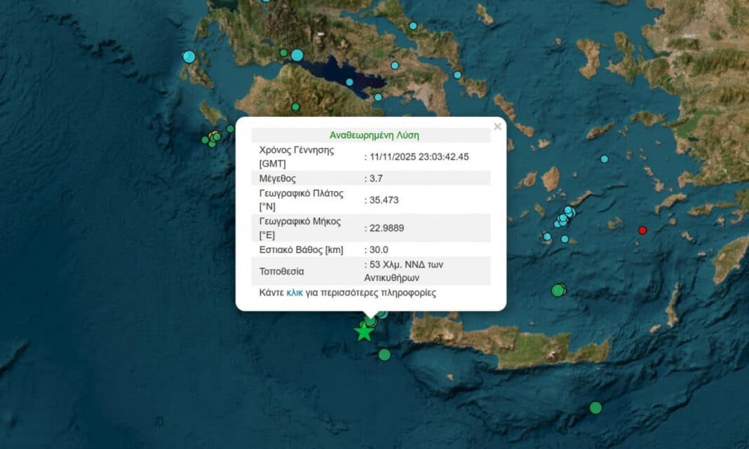 Σεισμός 3,7 Ρίχτερ δυτικά της Κρήτης – Κοντά στα Αντικύθηρα το επίκεντρο