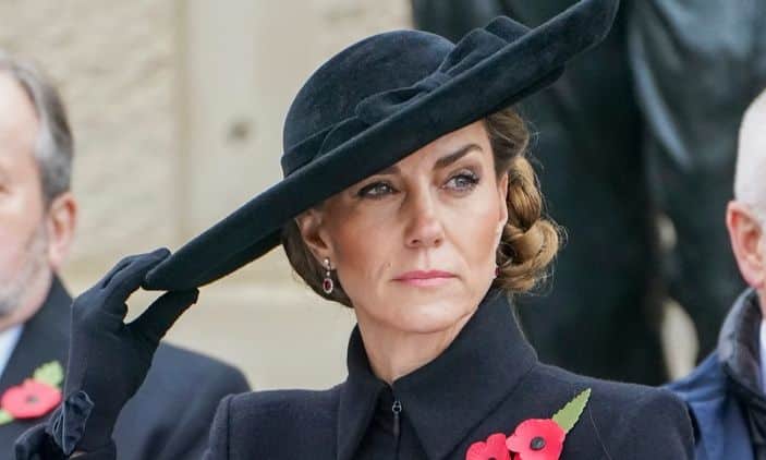 Για την περίσταση, επέλεξε ένα μαύρο παλτό-φόρεμα Catherine Walker, — ένα κομμάτι που έχει ξαναφορέσει το 2019 και το 2023 για την ίδια εκδήλωση. Η Κέιτ Μίντλετον συνόδευσε το παλτό με παπαρούνες και μία καρφίτσα με το έμβλημα των «Irish Guards».