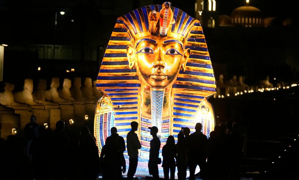 Η χρυσή ταφική μάσκα του βασιλιά Τουταγχαμών εκτίθεται κατά τη διάρκεια της πρώτης ημέρας για τους επισκέπτες μετά την επίσημη έναρξη λειτουργίας του Μεγάλου Αιγυπτιακού Μουσείου στη Γκίζα της Αιγύπτου, την Τρίτη 4 Νοεμβρίου 2025