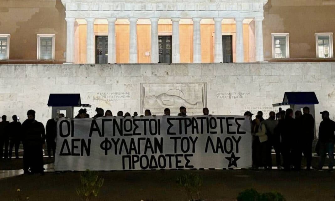 Αυτήν τη στιγμή παρέμβαση μελών του Ρουβίκωνα μπροστά από το μνημείο του Άγνωστου Στρατιώτη