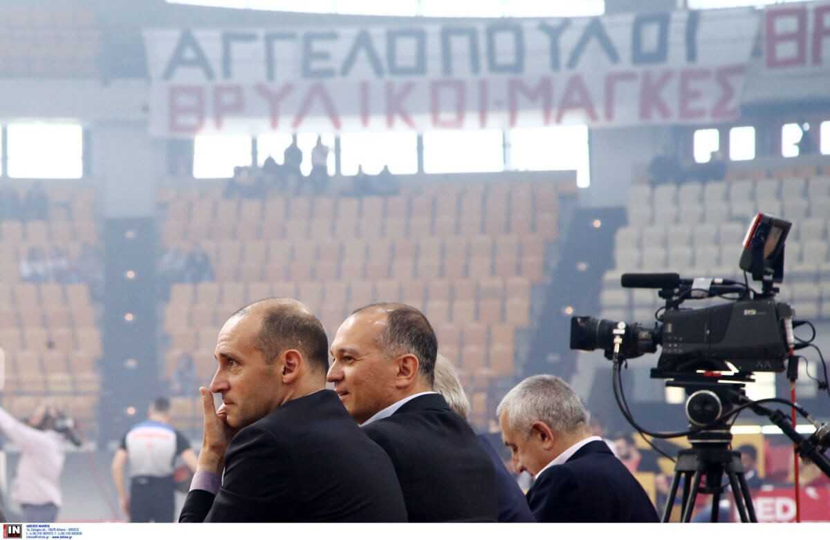 Με το πρωτάθλημα να είναι στον… αέρα μετά την αποχώρηση του Παναθηναϊκού, οι φίλοι των Πειραιωτών έστειλαν το δικό τους μήνυμα με πανό που έγραφαν «Θρυλικοί μάγκες Αγγελόπουλοι», «Θρύλε περηφάνεια μας», «Αφού δεν μας σέβεστε να μας φοβάστε» και «Τράκη ο στρατός σου λιποτακτεί». Τα πανό των οπαδών στο ΣΕΦ