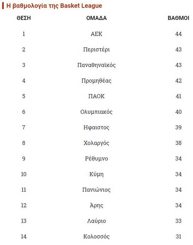 Με τον πλέον αναπάντεχο τρόπο ολοκληρώθηκε η κανονική διάρκεια της Basket League με την ΑΕΚ να βρίσκεται από το… πουθενά στην πρώτη θέση και τον Παναθηναϊκό να “πέφτει” πάνω στον Ολυμπιακό στα πλέι οφ. Υποβιβάστηκαν Κολοσσός Ρόδου και Λαύριο.