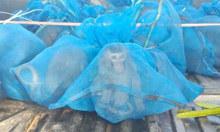 Αφού έλεγξαν την περιοχή, οι Αρχές βρήκαν 10 πλαστικά καλάθια κρυμμένα στο χωράφι που περιείχαν 62 μακάκους, ένα γένος μαϊμούδων που είναι ενδημικό στη Νοτιοανατολική Ασία και χρησιμοποιείται ευρέως στην ανάπτυξη φαρμάκων, επειδή το DNA του μοιάζει πολύ με αυτό των ανθρώπων. Υπάρχει επίσης μια ακμάζουσα μαύρη αγορά για το είδος αυτό, το οποίο θεωρείται «απειλούμενο» από την Διεθνή Ένωση για τη Διατήρηση της Φύσης.