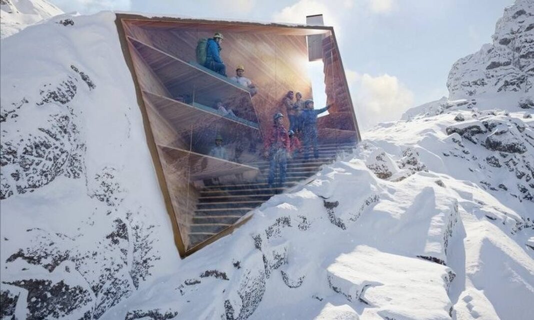 Σχεδιασμένο ενόψει των Χειμερινών Ολυμπιακών Αγώνων του 2026, το γυάλινο καταφύγιο θα μεταφερθεί με ελικόπτερο στην οριστική του θέση.
