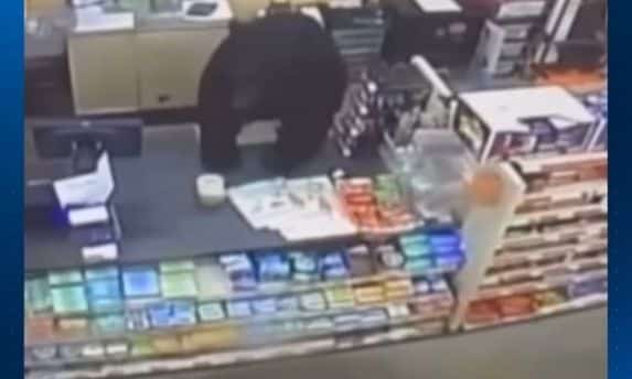 Η στιγμή που η αρκούδα πήδηξε πάνω από τον πάγκο, δευτερόλεπτα αφότου ταμίας και παιδί έφυγαν, καταγράφηκε σε βίντεο από κάμερες ασφαλείας.