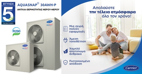 Για παράδειγμα, η Carrier AquaSnap 30AWH‑P χρησιμοποιεί φυσικό ψυκτικό μέσο R290, γνωστό για το πολύ χαμηλό δυναμικό υπερθέρμανσης, γεγονός που ελαχιστοποιεί το περιβαλλοντικό αποτύπωμα. Η ενεργειακή της απόδοση είναι εξαιρετική, με SCOP έως 4,82 και SEER έως 5,34, ενώ η ενεργειακή κλάση φτάνει έως A+++ για θερμοκρασία εξόδου νερού 35°C ή A++ για 55°C. Η μονάδα μπορεί να παρέχει θερμοκρασία εξόδου νερού έως 75°C, καθιστώντας την κατάλληλη για αντικατάσταση υφιστάμενου λέβητα σε ανακαινίσεις. Επιπλέον, η AquaSnap 30AWH‑P έχει σχεδιαστεί για εξαιρετικά χαμηλά επίπεδα θορύβου, με στάθμη ηχητικής πίεσης που ξεκινά από περίπου 24 dB(A) στα πέντε μέτρα (κατά ΕΝ12102-1) και διαθέτει νυχτερινή λειτουργία για ακόμα πιο αθόρυβη λειτουργία. Χάρη στον εξαιρετικά συμπαγή της σχεδιασμό -με αποτύπωμα μικρότερο από μισό τετραγωνικό μέτρο και βάρος γύρω στα 78 κιλά- η μονάδα μπορεί να τοποθετηθεί σχεδόν παντού, ακόμα και στο μπαλκόνι ενός διαμερίσματος, χωρίς να περιορίζει τον χώρο ή την αισθητική.