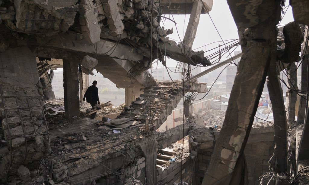 Ένα αγόρι οδηγάει το ποδήλατό του δίπλα από ερείπια στην πόλη της Γάζας, την Τρίτη 18 Νοεμβρίου 2025.