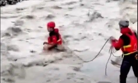 Την ίδια στιγμή, ο συνάδελφός του προσπαθεί να τον συγκρατήσει αλλά δεν τα καταφέρνει καθώς χάνει την ισορροπία του. Πέφτει και αυτός στο ποτάμι όπου τα ορμητικά νερά τον σταματάνε σε ένα βράχο. Με δύναμη κρατάει το σχοινί, μέχρι ο διασώστης να καταφέρει να βγει στην ακτή.