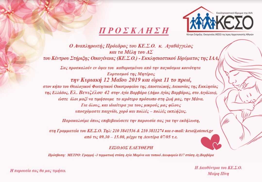 Για 5η συνεχή χρονιά το ΔΣ και η Διευθύντρια του Κέντρου Στήριξης Οικογένειας (ΚΕ.Σ.Ο.) – Εκκλησιαστικού Ιδρύματος της Ιεράς Αρχιεπισκοπής Αθηνών (ΙΑΑ) τιμούν την Μητέρα που αποτελεί τον πυρήνα της οικογένειας, η οποία γενικά δοκιμάζεται τα τελευταία χρόνια στη χώρα μας