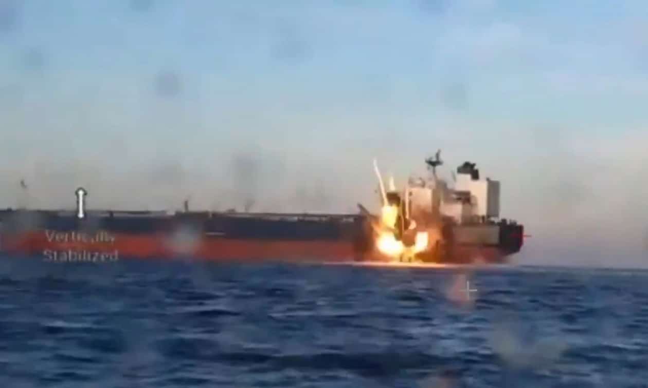 Τα πλάνα – που επαληθεύτηκαν από το BBC – δείχνουν τα θαλάσσια drones να επιταχύνουν μέσα από τα κύματα προς τα πλοία, πριν εκραγούν σε μια μεγάλη πυρόσφαιρα, στέλνοντας μαύρο καπνό στον αέρα.