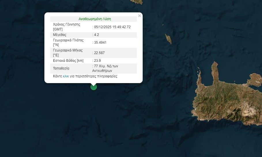 Το επίκεντρο του σεισμού εντοπίζεται στη θαλάσσια περιοχή που βρίσκεται σε απόσταση 77 χιλιομέτρων νοτιοδυτικά των Αντικυθήρων και δυτικά της Κρήτης