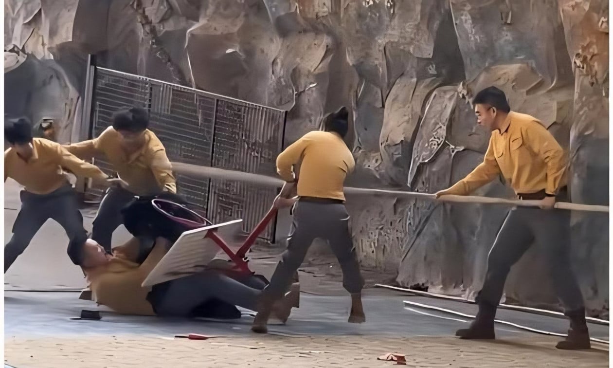 Άμεσα συνάδερφοί του σπεύδουν να βοηθήσουν χρησιμοποιώντας ένα καλάθι μπάσκετ, μια καρέκλα και ένα μπαμπού για να απωθήσουν το ζώο, το οποίο είχε εξιτάρει μια μεγάλη τσάντα με καρότα και μήλα που κουβαλούσε ο εκπαιδευτής του.
