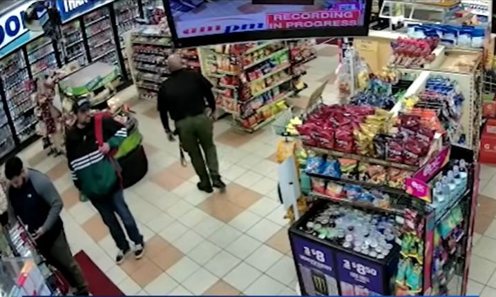 Στο βίντεο φαίνεται ο κατηγορούμενος, φορώντας μαύρο καπέλο και κουβαλώντας ένα κόκκινο σακίδιο, να περιμένει στη σειρά και να αγοράζει το αναψυκτικό πριν τον συλλάβουν οι αστυνομικοί.