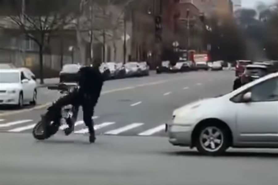 Αφού καταφέρνει να ξεκινήσει, περνάει ένα κόκκινο και στη προσπάθεια του να αποφύγει το κάθετα διερχόμενο αυτοκίνητο, τρομάζει, ανοίγει άτσαλα το γκάζι και πέφτει! Ευτυχώς δεν τραυματίστηκε, αλλά θέλουμε να πιστεύουμε ότι μετά από αυτό να έβαλε μυαλό!