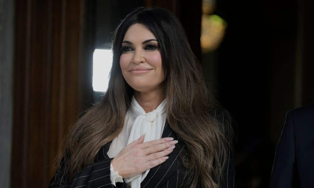 Kimberly Guilfoyle speaks as President Donald Trump listens at a reception celebrating Greek Independence Day in the East Room of the White House, Monday, March 24, 2025, in Washington. (AP Photo/Mark Schiefelbein)