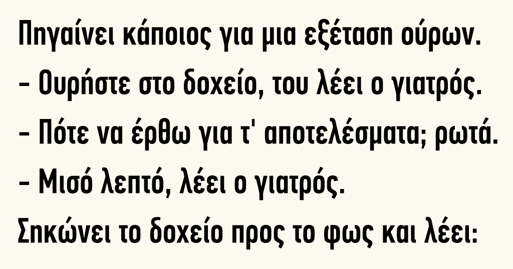 Πηγαίνει κάποιος για μια εξέταση ούρων 19 Νοεμβρίου 2019 17:54 FacebookTwitterTelegramViberWhatsAppLinkedinEmail Πηγαίνει κάποιος για μια εξέταση ούρων FacebookTwitterTelegramViberWhatsAppLinkedinEmail Προηγούμενο άρθροΠοια είναι η καλύτερη ώρα να απολαύσεις ένα χυμό;Επόμενο άρθροΚόκε: Video από την επιχείρηση της αστυνομίας. «Θησαυρός» με χασίς και όπλα – video Μπορεί να σας αρέσουν Ανέκδοτα 45αρης “καυτός” σε ανέκδοτο: “Έτσι βγαίνει ένα διαζύγιο” 25 Νοεμβρίου 2025 20:18 Ανέκδοτα Βουνίσιος βοσκός σε ανέκδοτο: Δεν έβρισκε λύση… 25 Νοεμβρίου 2025 17:18 Ανέκδοτα Ξανθιά γειτόνισσα σε ανέκδοτο “Γιατί κοκκινίζουν;” 25 Νοεμβρίου 2025 13:54 Αφήστε ένα μήνυμα Σχόλιο: εισάγετε το σχόλιό σας! Όνομα: παρακαλώ εισάγετε το όνομά σας εδώ Email: έχετε εισάγει εσφαλμένη διεύθυνση ηλεκτρονικού ταχυδρομείου! παρακαλώ εισάγετε εδώ την ηλεκτρονική σας διεύθυνση Ιστοσελίδα: αποθηκεύστε το όνομα, το ηλεκτρονικό ταχυδρομείο και τον ιστότοπό μου σε αυτό το πρόγραμμα περιήγησης για την επόμενη φορά που θα σχολιάσω.