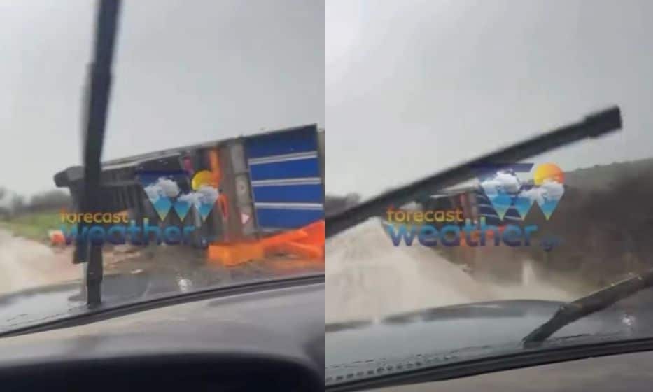 Νωρίτερα, νταλίκα ανετράπη λόγω των ισχυρών ανέμων και της έντονης βροχόπτωσης, λίγο έξω από το Ροδοτόπι των Ιωαννίνων.