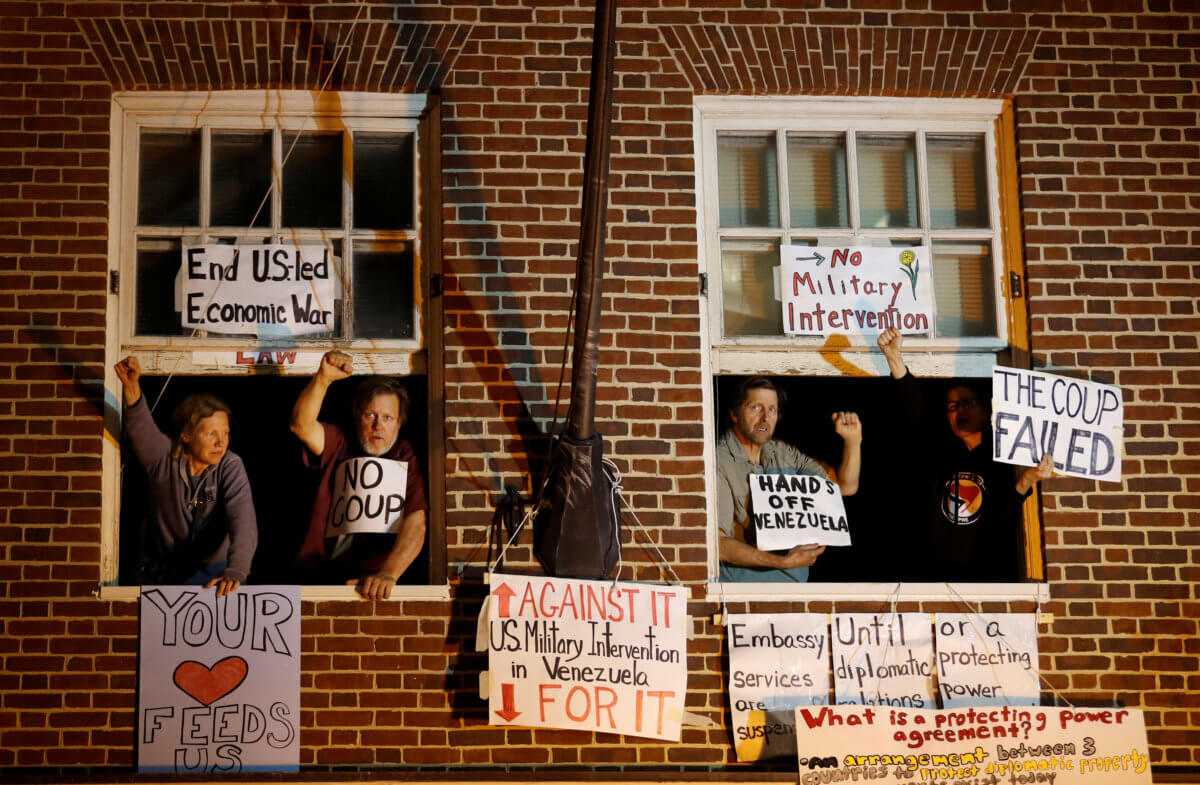 Ακροαριστερές ομάδες και φιλειρηνιστές ακτιβιστές πραγματοποιούν κατάληψη στην πρεσβεία εδώ και αρκετές εβδομάδες, καταγγέλλοντας την επιθυμία των ΗΠΑ να υποκινήσουν ένα «πραξικόπημα» εναντίον του Μαδούρο.