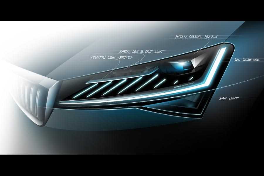 Επιπλέον, το ανανεωμένο Superb διαθέτει νέα LED φώτα ομίχλης και full LED πίσω φωτιστικά σώματα με δυναμικά φλας (βλ. παρακάτω βίντεο). Στο σκίτσο των full LED Matrix εμπρός προβολέων αποκαλύπτεται ο σχεδιασμός του πρωτοποριακού συστήματος φωτισμού. Αυτό αποτελείται από μια μονάδα LED για τα φώτα διασταύρωσης και τη δέσμη φωτός, καθώς και από τρία επιπλέον LED τμήματα μεγάλης δέσμης LED, ενώ φέρει τα λογότυπα «Skoda Crystal Lighiting». Μια λεπτή λωρίδα LED παρέχει τους δείκτες, τα φώτα ημέρας και το φως θέσης. Πάνω από αυτό είναι οι λεπτές δομές LED τύπου βελόνας, οι οποίες αποτελούν μέρος της νέας κινούμενης λειτουργίας Coming/Leaving Home.