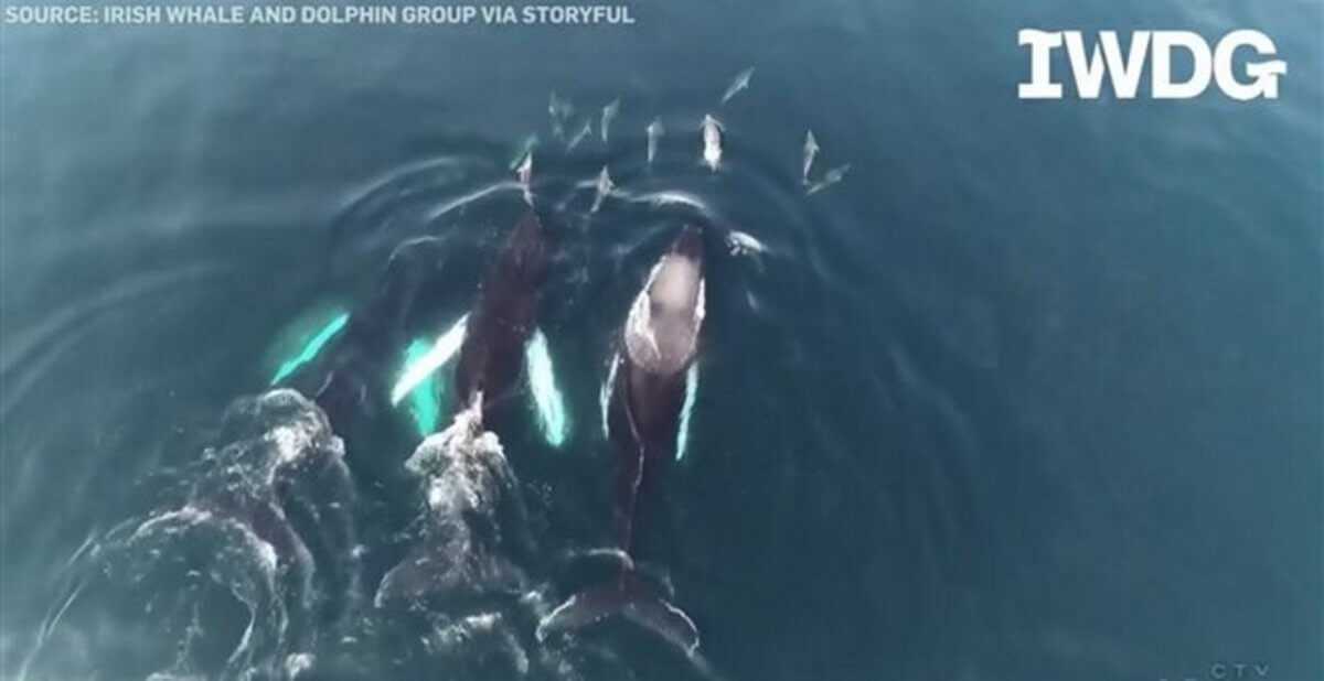 Απίστευτη είναι η σκηνή που κατέγραψε drone που δείχνει με ένα κοπάδι δελφινιών να παίζει με μεγάπτερες φάλαινες σε ακτή της Ιρλανδίας.
