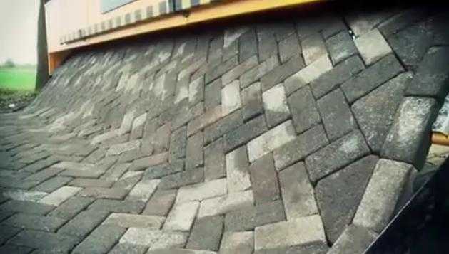 Οι εργάτες στην κορυφή της πλατφόρμας, τοποθετούν τα τούβλα σε ένα άνοιγμα, με συγκεκριμένο τρόπο και διάταξη κάθε φορά. Καθώς το μηχάνημα κινείται, η βαρύτητα τα στρώνει σαν χαλί στην επιφάνεια του εδάφους χωρίς να χαλάσει το περίεργο αυτό μωσαϊκό.